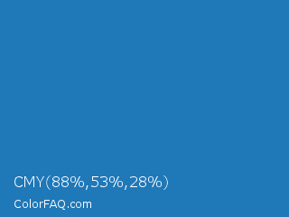 CMY 88,53,28 Color is a normal blue color and the nearest color is Cyan Cornflower Blue #188bc2. Hex code #1f78b8 and RGB value is rgb(31,120,184). In RGB color space, this color is composed of 12% red, 47% green, 72% blue, In CMYK color space, this color is composed of 83% cyan, 35% magenta, 0% yellow , 28% black , In HSL color space, this color has a hue angle of 205° , 71% saturation and 42% lightness.