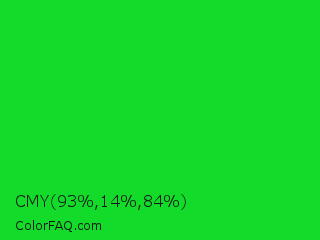 CMY 93,14,84 Color is a normal green color and the nearest color is Vivid Malachite #00cc33. Hex code #12db29 and RGB value is rgb(18,219,41). In RGB color space, this color is composed of 7% red, 86% green, 16% blue, In CMYK color space, this color is composed of 92% cyan, 0% magenta, 81% yellow , 14% black , In HSL color space, this color has a hue angle of 127° , 85% saturation and 46% lightness.