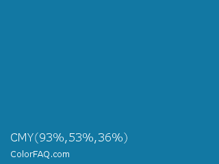 CMY 93,53,36 Color is a normal blue color and the nearest color is Allports #0076a3. Hex code #1278a3 and RGB value is rgb(18,120,163). In RGB color space, this color is composed of 7% red, 47% green, 64% blue, In CMYK color space, this color is composed of 89% cyan, 26% magenta, 0% yellow , 36% black , In HSL color space, this color has a hue angle of 198° , 80% saturation and 35% lightness.