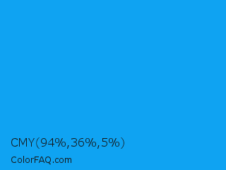 CMY 94,36,5 Color is a normal blue color and the nearest color is Vivid Cerulean #00aaee. Hex code #0fa3f2 and RGB value is rgb(15,163,242). In RGB color space, this color is composed of 6% red, 64% green, 95% blue, In CMYK color space, this color is composed of 94% cyan, 33% magenta, 0% yellow , 5% black , In HSL color space, this color has a hue angle of 201° , 90% saturation and 50% lightness.