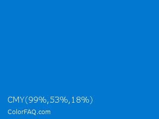 CMY 99,53,18 Color is a normal blue color and the nearest color is True Blue #0073cf. Hex code #0378d1 and RGB value is rgb(3,120,209). In RGB color space, this color is composed of 1% red, 47% green, 82% blue, In CMYK color space, this color is composed of 99% cyan, 43% magenta, 0% yellow , 18% black , In HSL color space, this color has a hue angle of 206° , 97% saturation and 42% lightness.