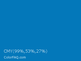 CMY 99,53,27 Color is a normal blue color and the nearest color is Star Command Blue #007bb8. Hex code #0378ba and RGB value is rgb(3,120,186). In RGB color space, this color is composed of 1% red, 47% green, 73% blue, In CMYK color space, this color is composed of 98% cyan, 35% magenta, 0% yellow , 27% black , In HSL color space, this color has a hue angle of 202° , 97% saturation and 37% lightness.