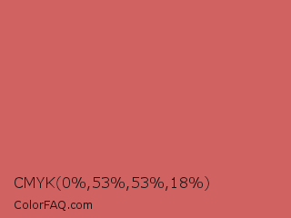 CMYK 0,53,53,18 Color is a normal red color and the nearest color is Fuzzy Wuzzy #cc6666. Hex code #d16262 and RGB value is rgb(209,98,98). In RGB color space, this color is composed of 82% red, 38% green, 38% blue, In CMYK color space, this color is composed of 0% cyan, 53% magenta, 53% yellow , 18% black , In HSL color space, this color has a hue angle of 0° , 55% saturation and 60% lightness.