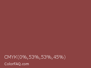 CMYK 0,53,53,45 Color is a normal red color and the nearest color is Tosca #8d3f3f. Hex code #8c4242 and RGB value is rgb(140,66,66). In RGB color space, this color is composed of 55% red, 26% green, 26% blue, In CMYK color space, this color is composed of 0% cyan, 53% magenta, 53% yellow , 45% black , In HSL color space, this color has a hue angle of 0° , 36% saturation and 40% lightness.