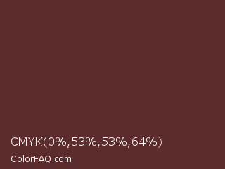 CMYK 0,53,53,64 Color is a dark red color and the nearest color is Buccaneer #622f30. Hex code #5c2b2b and RGB value is rgb(92,43,43). In RGB color space, this color is composed of 36% red, 17% green, 17% blue, In CMYK color space, this color is composed of 0% cyan, 53% magenta, 53% yellow , 64% black , In HSL color space, this color has a hue angle of 0° , 36% saturation and 26% lightness.
