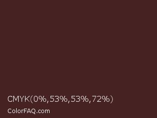 CMYK 0,53,53,72 Color is a very dark red color and the nearest color is Crater Brown #462425. Hex code #472222 and RGB value is rgb(71,34,34). In RGB color space, this color is composed of 28% red, 13% green, 13% blue, In CMYK color space, this color is composed of 0% cyan, 53% magenta, 53% yellow , 72% black , In HSL color space, this color has a hue angle of 0° , 35% saturation and 21% lightness.