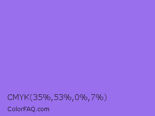 CMYK 35,53,0,7 Color is a light indigo color and the nearest color is Medium Purple #9370db. Hex code #9a6fed and RGB value is rgb(154,111,237). In RGB color space, this color is composed of 60% red, 44% green, 93% blue, In CMYK color space, this color is composed of 35% cyan, 53% magenta, 0% yellow , 7% black , In HSL color space, this color has a hue angle of 260° , 78% saturation and 68% lightness.