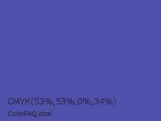 CMYK 53,53,0,34 Color is a normal blue color and the nearest color is Liberty #545aa7. Hex code #4f4fa8 and RGB value is rgb(79,79,168). In RGB color space, this color is composed of 31% red, 31% green, 66% blue, In CMYK color space, this color is composed of 53% cyan, 53% magenta, 0% yellow , 34% black , In HSL color space, this color has a hue angle of 240° , 36% saturation and 48% lightness.