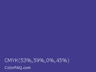 CMYK 53,59,0,45 Color is a normal indigo color and the nearest color is Dark Slate Blue #483d8b. Hex code #423a8c and RGB value is rgb(66,58,140). In RGB color space, this color is composed of 26% red, 23% green, 55% blue, In CMYK color space, this color is composed of 53% cyan, 59% magenta, 0% yellow , 45% black , In HSL color space, this color has a hue angle of 246° , 41% saturation and 39% lightness.