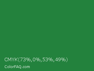 CMYK 73,0,53,49 Color is a normal green color and the nearest color is Dark Spring Green #177245. Hex code #23823d and RGB value is rgb(35,130,61). In RGB color space, this color is composed of 14% red, 51% green, 24% blue, In CMYK color space, this color is composed of 73% cyan, 0% magenta, 53% yellow , 49% black , In HSL color space, this color has a hue angle of 136° , 58% saturation and 32% lightness.