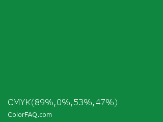 CMYK 89,0,53,47 Color is a dark green color and the nearest color is Salem #097f4b. Hex code #0f8740 and RGB value is rgb(15,135,64). In RGB color space, this color is composed of 6% red, 53% green, 25% blue, In CMYK color space, this color is composed of 89% cyan, 0% magenta, 53% yellow , 47% black , In HSL color space, this color has a hue angle of 145° , 80% saturation and 29% lightness.