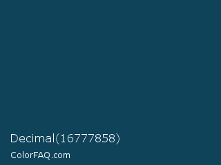 Decimal 16777858 Color is a very dark blue color and the nearest color is Teal Blue #044259. Hex code #0f435a and RGB value is rgb(15,67,90). In RGB color space, this color is composed of 6% red, 26% green, 35% blue, In CMYK color space, this color is composed of 83% cyan, 26% magenta, 0% yellow , 65% black , In HSL color space, this color has a hue angle of 198° , 71% saturation and 21% lightness.