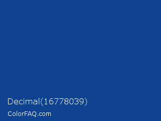 Decimal 16778039 Color is a normal blue color and the nearest color is Yale Blue #0f4d92. Hex code #0f4391 and RGB value is rgb(15,67,145). In RGB color space, this color is composed of 6% red, 26% green, 57% blue, In CMYK color space, this color is composed of 90% cyan, 54% magenta, 0% yellow , 43% black , In HSL color space, this color has a hue angle of 216° , 81% saturation and 31% lightness.