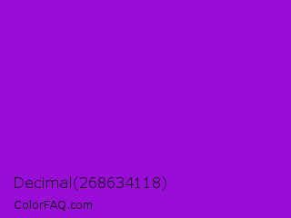 Decimal 268634118 Color is a normal purple color and the nearest color is Dark Violet #9400d3. Hex code #990ed6 and RGB value is rgb(153,14,214). In RGB color space, this color is composed of 60% red, 5% green, 84% blue, In CMYK color space, this color is composed of 29% cyan, 93% magenta, 0% yellow , 16% black , In HSL color space, this color has a hue angle of 282° , 88% saturation and 45% lightness.