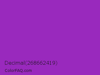 Decimal 268662419 Color is a normal purple color and the nearest color is Dark Orchid #9932cc. Hex code #9929bd and RGB value is rgb(153,41,189). In RGB color space, this color is composed of 60% red, 16% green, 74% blue, In CMYK color space, this color is composed of 19% cyan, 78% magenta, 0% yellow , 26% black , In HSL color space, this color has a hue angle of 285° , 64% saturation and 45% lightness.