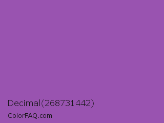 Decimal 268731442 Color is a normal purple color and the nearest color is Purpureus #9a4eae. Hex code #9953b0 and RGB value is rgb(153,83,176). In RGB color space, this color is composed of 60% red, 33% green, 69% blue, In CMYK color space, this color is composed of 13% cyan, 53% magenta, 0% yellow , 31% black , In HSL color space, this color has a hue angle of 285° , 37% saturation and 51% lightness.