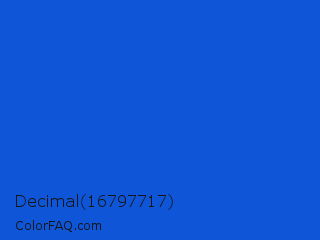 Decimal 16797717 Color is a normal blue color and the nearest color is Science Blue #0066cc. Hex code #0f55d7 and RGB value is rgb(15,85,215). In RGB color space, this color is composed of 6% red, 33% green, 84% blue, In CMYK color space, this color is composed of 93% cyan, 60% magenta, 0% yellow , 16% black , In HSL color space, this color has a hue angle of 219° , 87% saturation and 45% lightness.