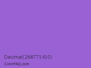 Decimal 268771410 Color is a light violet color and the nearest color is Amethyst #9966cc. Hex code #9961d4 and RGB value is rgb(153,97,212). In RGB color space, this color is composed of 60% red, 38% green, 83% blue, In CMYK color space, this color is composed of 28% cyan, 54% magenta, 0% yellow , 17% black , In HSL color space, this color has a hue angle of 269° , 57% saturation and 61% lightness.