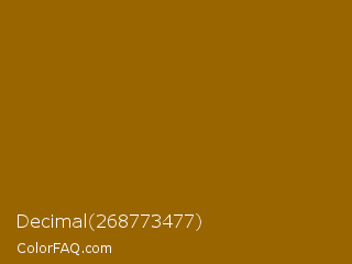 Decimal 268773477 Color is a dark orange color and the nearest color is Gamboge Orange Brown #996600. Hex code #996501 and RGB value is rgb(153,101,1). In RGB color space, this color is composed of 60% red, 40% green, 0% blue, In CMYK color space, this color is composed of 0% cyan, 34% magenta, 99% yellow , 40% black , In HSL color space, this color has a hue angle of 39° , 99% saturation and 30% lightness.