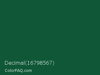 Decimal 16798567 Color is a very dark green color and the nearest color is Sacramento State Green #00563f. Hex code #0f5737 and RGB value is rgb(15,87,55). In RGB color space, this color is composed of 6% red, 34% green, 22% blue, In CMYK color space, this color is composed of 83% cyan, 0% magenta, 37% yellow , 66% black , In HSL color space, this color has a hue angle of 153° , 71% saturation and 20% lightness.