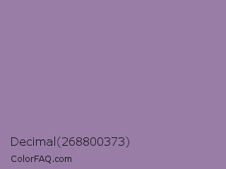 Decimal 268800373 Color is a normal purple color and the nearest color is Lavender Purple #967bb6. Hex code #997da7 and RGB value is rgb(153,125,167). In RGB color space, this color is composed of 60% red, 49% green, 65% blue, In CMYK color space, this color is composed of 8% cyan, 25% magenta, 0% yellow , 35% black , In HSL color space, this color has a hue angle of 280° , 19% saturation and 57% lightness.