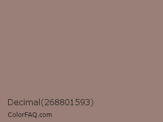 Decimal 268801593 Color is a normal red color and the nearest color is Cinereous #98817b. Hex code #997f77 and RGB value is rgb(153,127,119). In RGB color space, this color is composed of 60% red, 50% green, 47% blue, In CMYK color space, this color is composed of 0% cyan, 17% magenta, 22% yellow , 40% black , In HSL color space, this color has a hue angle of 14° , 14% saturation and 53% lightness.