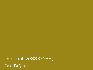 Decimal 268833588 Color is a normal yellow color and the nearest color is Hacienda #98811b. Hex code #998616 and RGB value is rgb(153,134,22). In RGB color space, this color is composed of 60% red, 53% green, 9% blue, In CMYK color space, this color is composed of 0% cyan, 12% magenta, 86% yellow , 40% black , In HSL color space, this color has a hue angle of 51° , 75% saturation and 34% lightness.