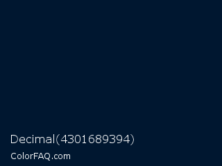 Decimal 4301689394 Color is a almost black blue color and the nearest color is Midnight #011635. Hex code #001730 and RGB value is rgb(0,23,48). In RGB color space, this color is composed of 0% red, 9% green, 19% blue, In CMYK color space, this color is composed of 100% cyan, 52% magenta, 0% yellow , 81% black , In HSL color space, this color has a hue angle of 211° , 100% saturation and 9% lightness.