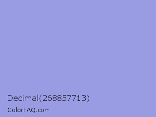 Decimal 268857713 Color is a light blue color and the nearest color is Dull Lavender #a899e6. Hex code #999ce3 and RGB value is rgb(153,156,227). In RGB color space, this color is composed of 60% red, 61% green, 89% blue, In CMYK color space, this color is composed of 33% cyan, 31% magenta, 0% yellow , 11% black , In HSL color space, this color has a hue angle of 238° , 57% saturation and 75% lightness.