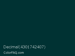Decimal 4301742407 Color is a very dark cyan color and the nearest color is Deep Teal #003532. Hex code #003233 and RGB value is rgb(0,50,51). In RGB color space, this color is composed of 0% red, 20% green, 20% blue, In CMYK color space, this color is composed of 100% cyan, 2% magenta, 0% yellow , 80% black , In HSL color space, this color has a hue angle of 181° , 100% saturation and 10% lightness.