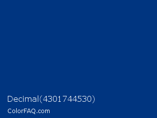 Decimal 4301744530 Color is a dark blue color and the nearest color is Catalina Blue #062a78. Hex code #003580 and RGB value is rgb(0,53,128). In RGB color space, this color is composed of 0% red, 21% green, 50% blue, In CMYK color space, this color is composed of 100% cyan, 59% magenta, 0% yellow , 50% black , In HSL color space, this color has a hue angle of 215° , 100% saturation and 25% lightness.