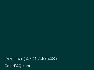 Decimal 4301746548 Color is a very dark cyan color and the nearest color is Deep Teal #003532. Hex code #003636 and RGB value is rgb(0,54,54). In RGB color space, this color is composed of 0% red, 21% green, 21% blue, In CMYK color space, this color is composed of 100% cyan, 0% magenta, 0% yellow , 79% black , In HSL color space, this color has a hue angle of 180° , 100% saturation and 11% lightness.