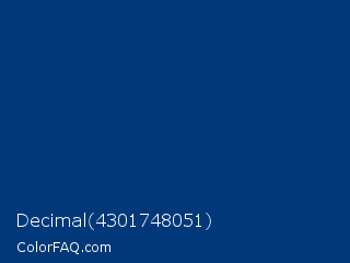 Decimal 4301748051 Color is a dark blue color and the nearest color is Catalina Blue #062a78. Hex code #003879 and RGB value is rgb(0,56,121). In RGB color space, this color is composed of 0% red, 22% green, 47% blue, In CMYK color space, this color is composed of 100% cyan, 54% magenta, 0% yellow , 53% black , In HSL color space, this color has a hue angle of 212° , 100% saturation and 24% lightness.