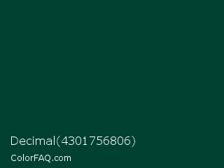 Decimal 4301756806 Color is a very dark cyan color and the nearest color is Sherwood Green #02402c. Hex code #004132 and RGB value is rgb(0,65,50). In RGB color space, this color is composed of 0% red, 25% green, 20% blue, In CMYK color space, this color is composed of 100% cyan, 0% magenta, 23% yellow , 75% black , In HSL color space, this color has a hue angle of 166° , 100% saturation and 13% lightness.
