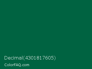Decimal 4301817605 Color is a very dark green color and the nearest color is Cadmium Green #006b3c. Hex code #006341 and RGB value is rgb(0,99,65). In RGB color space, this color is composed of 0% red, 39% green, 25% blue, In CMYK color space, this color is composed of 100% cyan, 0% magenta, 34% yellow , 61% black , In HSL color space, this color has a hue angle of 159° , 100% saturation and 19% lightness.