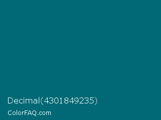 Decimal 4301849235 Color is a dark cyan color and the nearest color is Mosque #036a6e. Hex code #006975 and RGB value is rgb(0,105,117). In RGB color space, this color is composed of 0% red, 41% green, 46% blue, In CMYK color space, this color is composed of 100% cyan, 10% magenta, 0% yellow , 54% black , In HSL color space, this color has a hue angle of 186° , 100% saturation and 23% lightness.