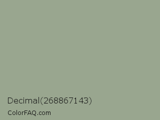 Decimal 268867143 Color is a light green color and the nearest color is Lemon Grass #9b9e8f. Hex code #99a68f and RGB value is rgb(153,166,143). In RGB color space, this color is composed of 60% red, 65% green, 56% blue, In CMYK color space, this color is composed of 8% cyan, 0% magenta, 14% yellow , 35% black , In HSL color space, this color has a hue angle of 94° , 11% saturation and 61% lightness.