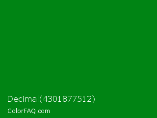 Decimal 4301877512 Color is a dark green color and the nearest color is Office Green #008000. Hex code #008414 and RGB value is rgb(0,132,20). In RGB color space, this color is composed of 0% red, 52% green, 8% blue, In CMYK color space, this color is composed of 100% cyan, 0% magenta, 85% yellow , 48% black , In HSL color space, this color has a hue angle of 129° , 100% saturation and 26% lightness.