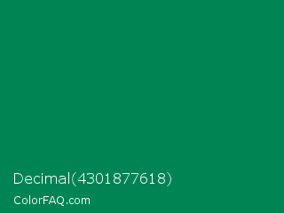 Decimal 4301877618 Color is a dark green color and the nearest color is Spanish Viridian #007f5c. Hex code #008454 and RGB value is rgb(0,132,84). In RGB color space, this color is composed of 0% red, 52% green, 33% blue, In CMYK color space, this color is composed of 100% cyan, 0% magenta, 36% yellow , 48% black , In HSL color space, this color has a hue angle of 158° , 100% saturation and 26% lightness.