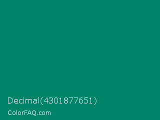 Decimal 4301877651 Color is a dark cyan color and the nearest color is Deep Sea #01826b. Hex code #008469 and RGB value is rgb(0,132,105). In RGB color space, this color is composed of 0% red, 52% green, 41% blue, In CMYK color space, this color is composed of 100% cyan, 0% magenta, 20% yellow , 48% black , In HSL color space, this color has a hue angle of 168° , 100% saturation and 26% lightness.