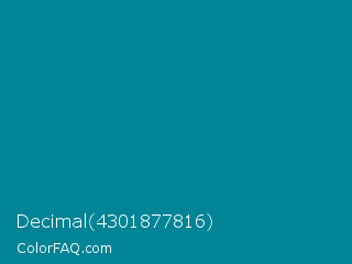 Decimal 4301877816 Color is a dark cyan color and the nearest color is Dark Cyan #008b8b. Hex code #008496 and RGB value is rgb(0,132,150). In RGB color space, this color is composed of 0% red, 52% green, 59% blue, In CMYK color space, this color is composed of 100% cyan, 12% magenta, 0% yellow , 41% black , In HSL color space, this color has a hue angle of 187° , 100% saturation and 29% lightness.