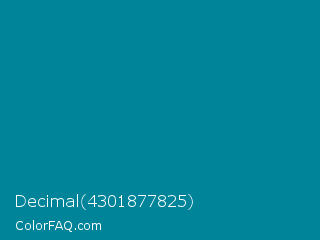 Decimal 4301877825 Color is a dark cyan color and the nearest color is CG Blue #007aa5. Hex code #008499 and RGB value is rgb(0,132,153). In RGB color space, this color is composed of 0% red, 52% green, 60% blue, In CMYK color space, this color is composed of 100% cyan, 14% magenta, 0% yellow , 40% black , In HSL color space, this color has a hue angle of 188° , 100% saturation and 30% lightness.