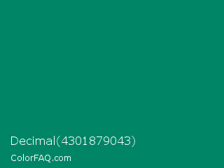 Decimal 4301879043 Color is a dark cyan color and the nearest color is Deep Sea #01826b. Hex code #008667 and RGB value is rgb(0,134,103). In RGB color space, this color is composed of 0% red, 53% green, 40% blue, In CMYK color space, this color is composed of 100% cyan, 0% magenta, 23% yellow , 47% black , In HSL color space, this color has a hue angle of 166° , 100% saturation and 26% lightness.