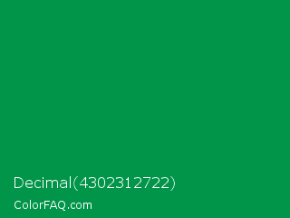 Decimal 4302312722 Color is a dark green color and the nearest color is Spanish Green #009150. Hex code #009548 and RGB value is rgb(0,149,72). In RGB color space, this color is composed of 0% red, 58% green, 28% blue, In CMYK color space, this color is composed of 100% cyan, 0% magenta, 52% yellow , 42% black , In HSL color space, this color has a hue angle of 149° , 100% saturation and 29% lightness.