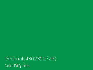 Decimal 4302312723 Color is a dark green color and the nearest color is Spanish Green #009150. Hex code #009549 and RGB value is rgb(0,149,73). In RGB color space, this color is composed of 0% red, 58% green, 29% blue, In CMYK color space, this color is composed of 100% cyan, 0% magenta, 51% yellow , 42% black , In HSL color space, this color has a hue angle of 149° , 100% saturation and 29% lightness.