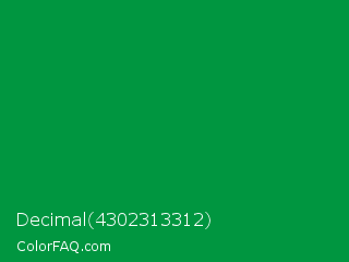 Decimal 4302313312 Color is a dark green color and the nearest color is North Texas Green #059033. Hex code #009640 and RGB value is rgb(0,150,64). In RGB color space, this color is composed of 0% red, 59% green, 25% blue, In CMYK color space, this color is composed of 100% cyan, 0% magenta, 57% yellow , 41% black , In HSL color space, this color has a hue angle of 146° , 100% saturation and 29% lightness.