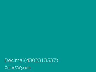 Decimal 4302313537 Color is a dark cyan color and the nearest color is Viridian Green #009698. Hex code #009691 and RGB value is rgb(0,150,145). In RGB color space, this color is composed of 0% red, 59% green, 57% blue, In CMYK color space, this color is composed of 100% cyan, 0% magenta, 3% yellow , 41% black , In HSL color space, this color has a hue angle of 178° , 100% saturation and 29% lightness.