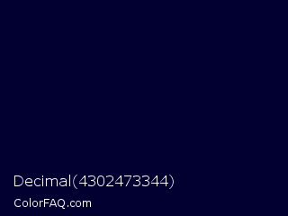 Decimal 4302473344 Color is a almost black indigo color and the nearest color is Black Rock #0d0332. Hex code #010030 and RGB value is rgb(1,0,48). In RGB color space, this color is composed of 0% red, 0% green, 19% blue, In CMYK color space, this color is composed of 98% cyan, 100% magenta, 0% yellow , 81% black , In HSL color space, this color has a hue angle of 241° , 100% saturation and 9% lightness.