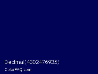 Decimal 4302476935 Color is a very dark blue color and the nearest color is Gulf Blue #051657. Hex code #010357 and RGB value is rgb(1,3,87). In RGB color space, this color is composed of 0% red, 1% green, 34% blue, In CMYK color space, this color is composed of 99% cyan, 97% magenta, 0% yellow , 66% black , In HSL color space, this color has a hue angle of 239° , 98% saturation and 17% lightness.