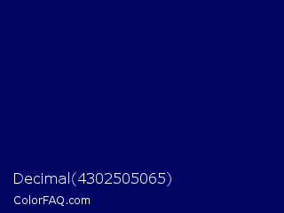 Decimal 4302505065 Color is a very dark blue color and the nearest color is Arapawa #110c6c. Hex code #010665 and RGB value is rgb(1,6,101). In RGB color space, this color is composed of 0% red, 2% green, 40% blue, In CMYK color space, this color is composed of 99% cyan, 94% magenta, 0% yellow , 60% black , In HSL color space, this color has a hue angle of 237° , 98% saturation and 20% lightness.